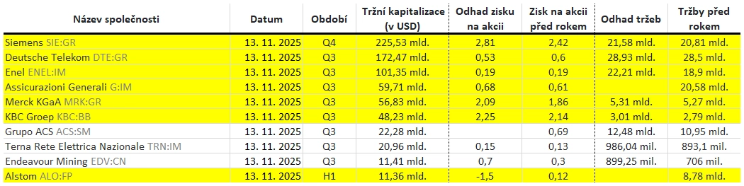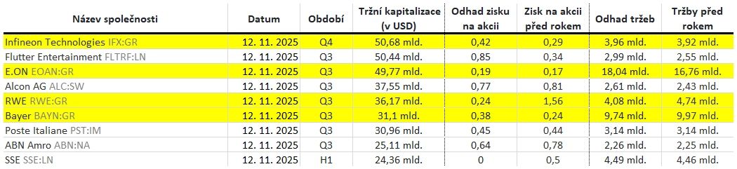 Které firmy představí výsledky hospodaření za uplynulý kvartál v týdnu od 10. listopadu 2025 a jaké zisky v rámci indexů S&P 500 a STOXX Europe 600 očekávají analytici oslovení agenturou LSEG?