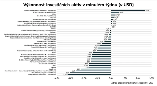 "Nejlepší výkonnost v americkém dolaru měly v týdnu akcie v Latinské Americe (+2,5 %), akcie ve střední a východní Evropě (+0,6 %) a zlato (+0,3 %), nejhorší naopak akcie firem z takzvané úžasné sedmičky (-3,2 %), Nasdaq (-3,0 %) a růstové akcie (-2,6 %). Zvýšení rizikové averze na globálních finančních trzích se mimo jiné projevilo nárůstem průměrné globální kreditní marže na korporátních high-yield dluhopisech o 10 bazických bodů na 313 bodů," doplnil stratég Michal Stupavský ze společnosti Conseq Investment Management.