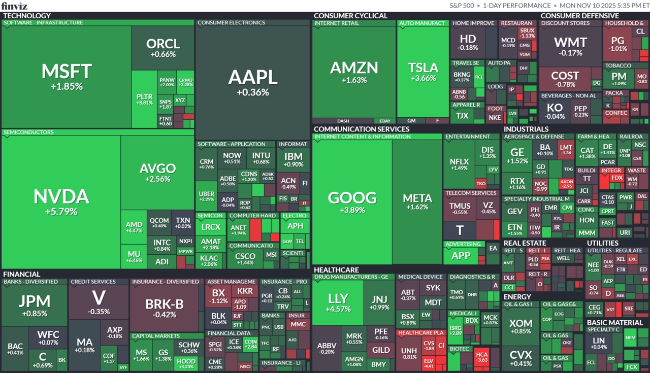 Hlavními tahouny růstu byly akcie firem zaměřených na umělou inteligenci, jako jsou NVIDIA (+5,79 %) nebo Broadcom (+2,56 %). Microsoft (+1,85 %) posílil po osmi dnech poklesu (nejdelší ztrátové sérii od roku 2011). Minulý týden stejné tituly táhly trh níže kvůli obavám z vysokého ocenění.