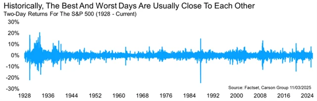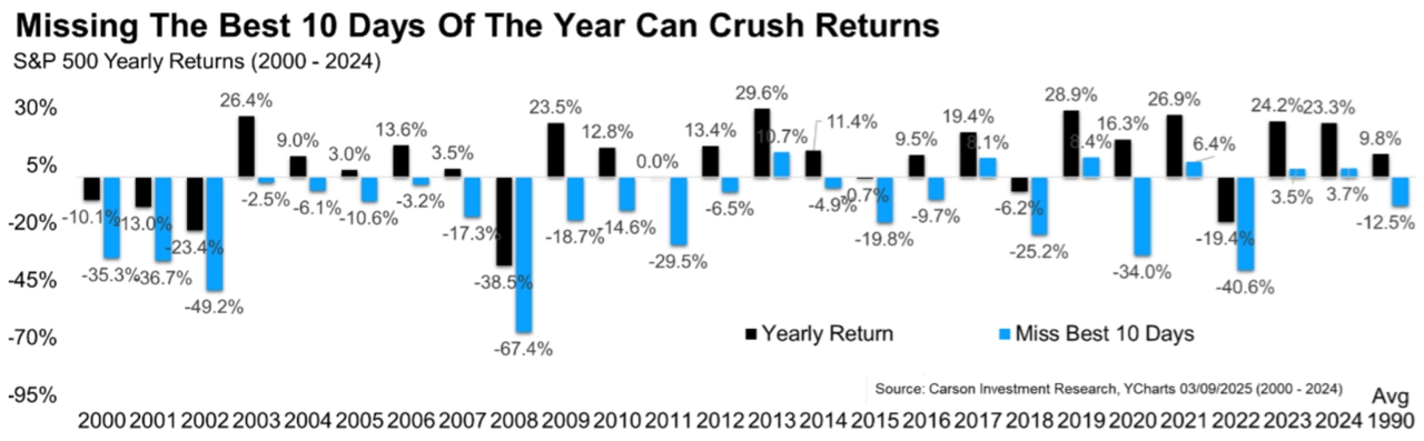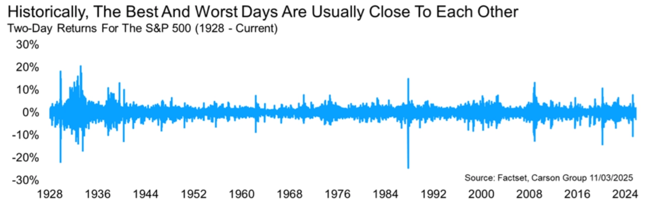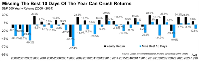 Jedním z důvodů je právě zmíněný výskyt hlubokých propadů a výrazných růstů blízko po sobě. Akciový index S&P 500 od roku 1990 celkově za rok v průměru vzrostl o 9,8 %, ale bez deseti nejlepších dnů roku by trh spadl o zhruba 12,5 %. Jistě, podobný "model" lze rozepsat i opačně, tedy pro index bez deseti nejhorších dnů roku, pak by statistika byla naopak úchvatně růstová. Ale pointa je jasná.
