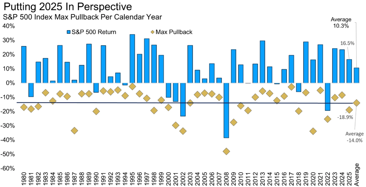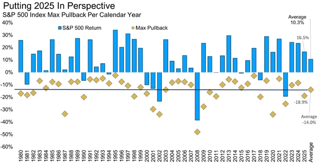 Každý rok se objevují znepokojivé zprávy a prudké poklesy. Kdo s tím počítá, dělá dobře. Letos se korekce po dvou silných letech většinově předpokládala a index S&P 500 zatím zaznamenal v rámci roku propad o 18,9 %. Průměrný rok od začátku 80. let končí růstem lehce přes 10 %, během něj ale dochází k poklesu z vrcholu na dno o 14 %.