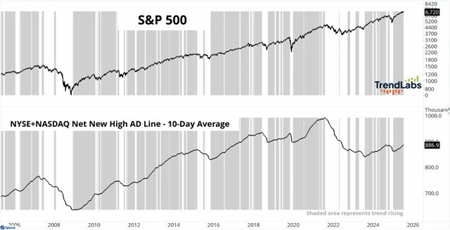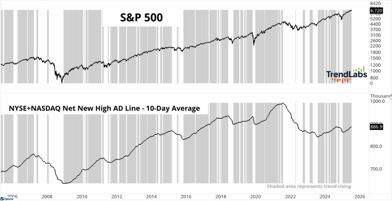 V týdnu, kdy S&P 500 klesl o 1,63 %, navíc sice mírně, ale přece stoupl i podíl titulů v indexu nad 50denním průměrem. A takzvaná "šíře" trhu se zlepšila i podle ukazatele sledujícího nová maxima a minima za poslední rok. Nových maxim bylo více než minim.