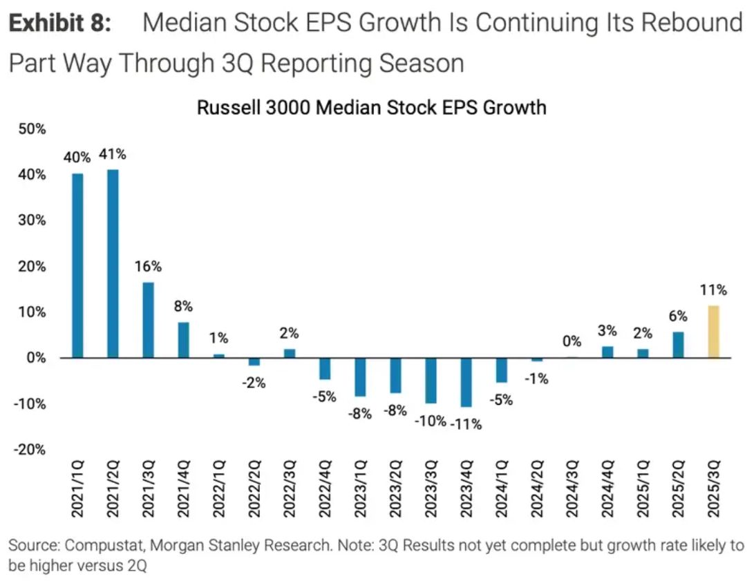 Minulý týden představitelé investičních bank Goldman Sachs a Morgan Stanley varovali, že trh v následujících kvartálech může projít korekcí. Ponechme stranou, že podobné výroky – už vzhledem ke statistice z prvního grafu v tomto článku – jsou vlastně tak trochu sázka na jistotu, respektive nemají v podstatě žádnou hodnotu (což neznamená, že na ně trh nereaguje). Ta samá Morgan Stanley v ten samý týden ústy svého hlavního akciového stratéga Michaela Wilsona ale zároveň nastínila pozitivní scénář pro americký trh na rok 2026.