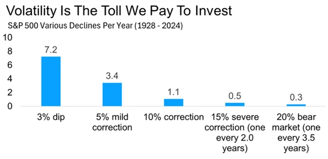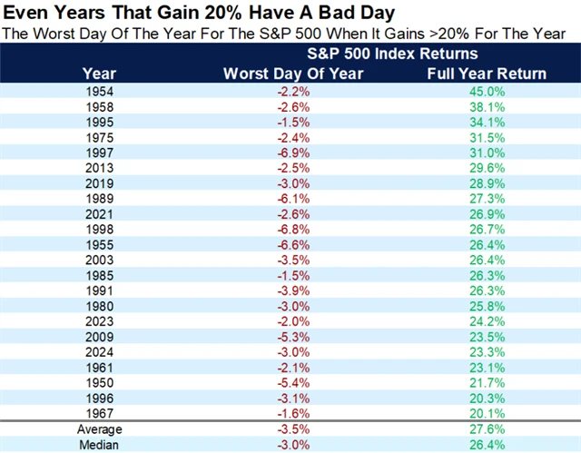 Hluboké denní propady se vyskytují i v letech, které jsou celkově pro americké akcie extrémně úspěšné. Kdo v takových letech v panice prodal během výrazných poklesů, mohl velice dobře přijít o velkou část celkového zhodnocení.