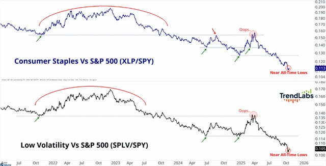 Jak navíc o víkendu připomněl Grant Hawkridge ze společnosti TrendLabs, na trhu není patrný příklon k defenzivním obchodům. Ilustroval to grafem relativní výkonnosti sektoru běžné spotřeby vůči indexu S&P 500 a také segmentu málo volatilních titulů vůči celému indexu.