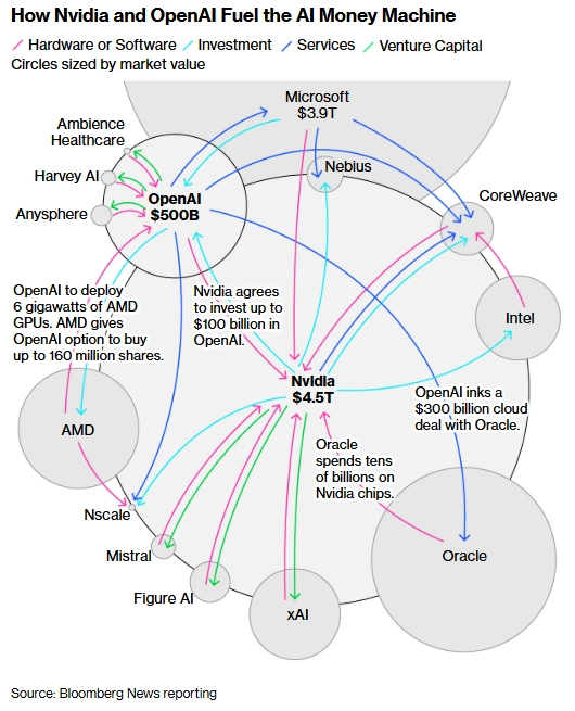 Je tu ale ještě jedno méně zjevné riziko, na které Michael Burry upozorňuje. To spočívá ve finanční provázanosti menších AI firem s technologickými giganty. Investice od nich proudí k menším firmám, které je okamžitě využívají na nákup čipů, výpočetní kapacity a služeb právě od těchto velkých hráčů.