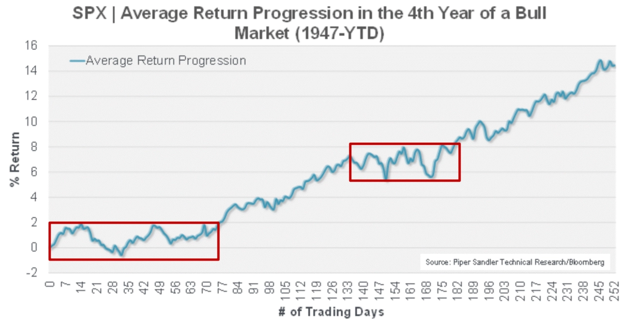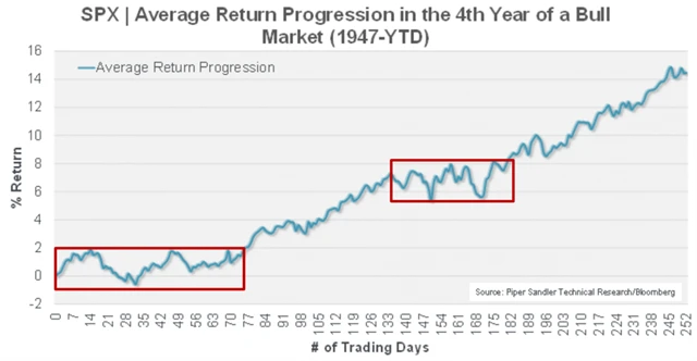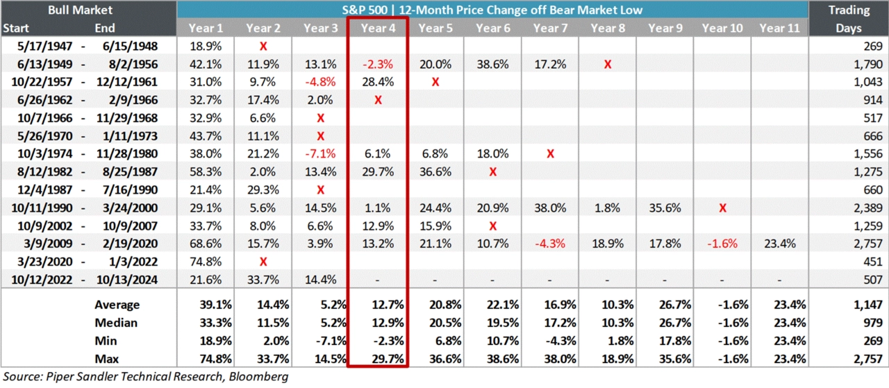 Historie není na trzích vodítkem pro budoucnost, není ale žádný hřích si připomenout, že když už se akciový býk dožil třetích narozenin, většinou ho čekaly i ty čtvrté. Šest ze sedmi býčích trhů po druhé světové válce pokračovalo i čtvrtý rok. V průměru byl index S&P 500 o 12,7 % výše.