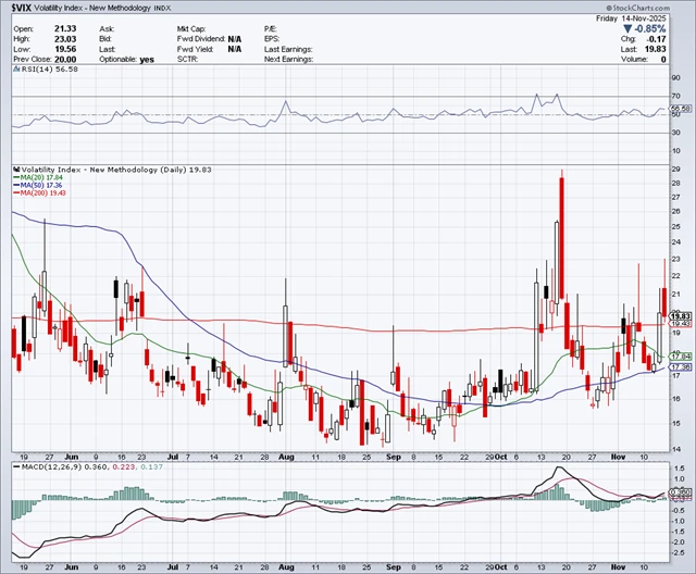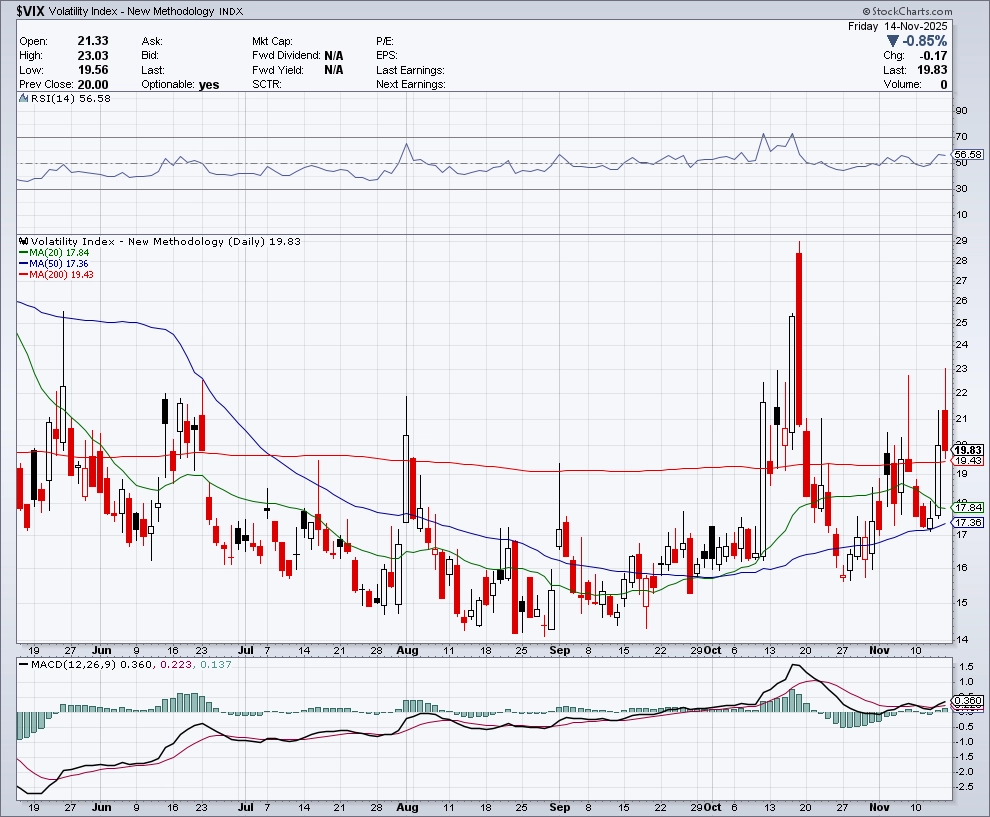 Index volatility VIX během týdne vystřelil nad 22 bodů, ve čtvrtek ale uzavřel na 20 a v pátek ještě o něco níže. Celkově se zvedl o 3,93 % a pro akciový trh vysílá smíšený signál – je zhruba na úrovni 200denního klouzavého průměru, nijak přesvědčivě nad něj ale nevyrazil.