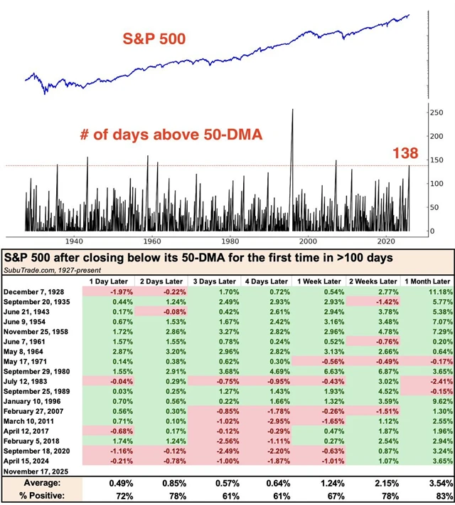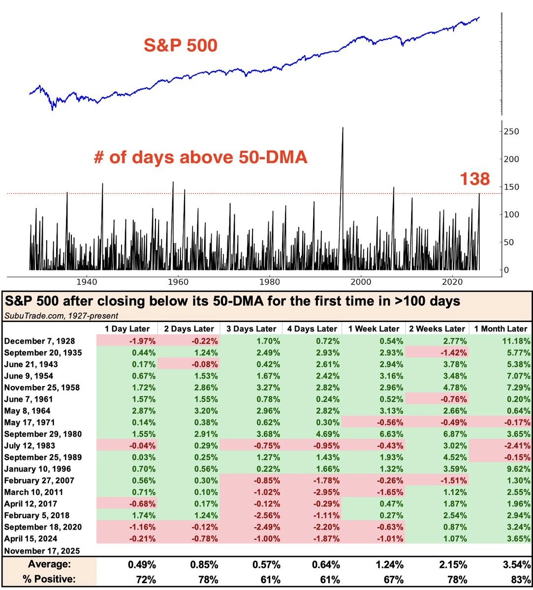 Po 138 obchodních dnech (tedy ten 139.) navíc index S&P 500 uzavřel pod svým 50denním klouzavým průměrem. Pokud toto proražení potvrdí, bude to z krátkodobého hlediska silný technický signál toho, že pullback může být hlubší a delší. Každopádně druhá série, která je už minulostí.