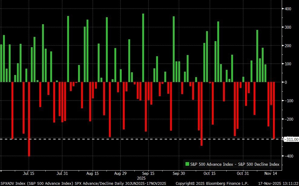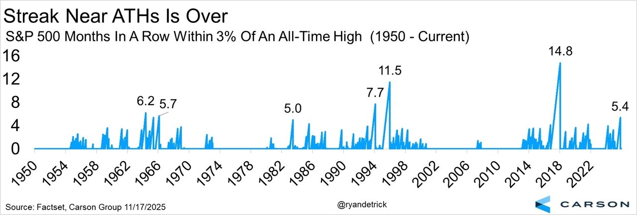 Je nicméně pravda, že v historii po skončení minimálně 100denních podobných sérií nad 50denním průměrem měl trh v měsíčním horizontu velice silnou tendenci znovu růst. Uvidíme letos, sezónnost by měla být příznivý (listopad a prosinec jsou pro akcie silné měsíce), krátkodobým katalyzátorem mohou být už tento týden oznámené hospodářské výsledky Nvidie (mimochodem, v pondělí derivátový trh signalizoval reakci ceny akcií největší firmy na trhu o zhruba 7 %).