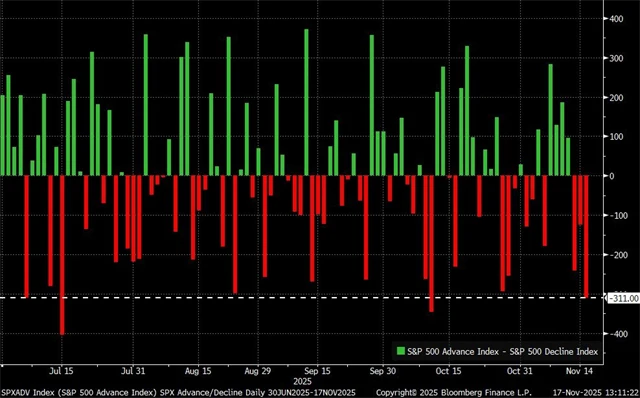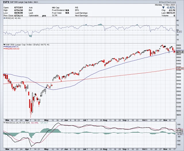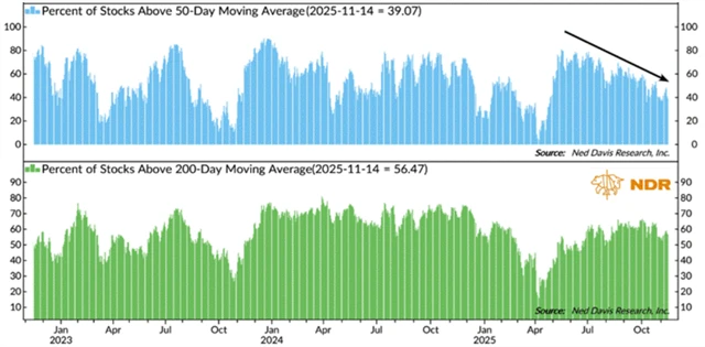 Akciový trh v USA slábne, minimálně krátkodobě. Nadšení z každé zmínky o umělé inteligenci vystřídala skepse ohledně vysokých nákladů a horizontu návratnosti masivních investic, komentáře představitelů Fedu brzdí očekávání brzkého snižování sazeb, trh si i proto více všímá vysokých valuací akcií a podíl jednotlivých titulů pod 50- a 200denními průměry v rámci indexu S&P 500 dále klesá.