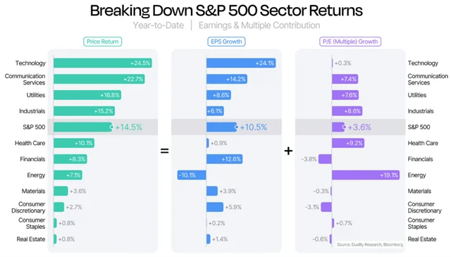 A na závěr je tak pro zajímavost ještě jeden graf. Ten ukazuje, že letos technologický sektor (jediný, který na přelomu října a listopadu od dubnového minima na trhu překonával celý index S&P 500) zpevňuje v zásadě pouze na základě růstu zisků firem, jeho valuace prakticky nevzrostla. To může hodně investorů překvapit. Energetika nebo zdravotní péče naopak výrazně "zdražily".