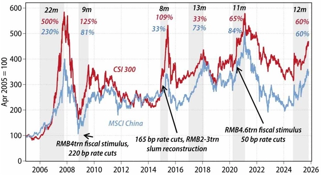 Ruku v ruce s tím se začal měnit i sentiment na akciových trzích. Od představení kroků Pekingu na podporu čínských akcií v lednu 2024 překonává čínský trh výkonnost amerických akcií zhruba v poměru dva ku jedné. To je pro mnohé překvapivé, protože se tento obrat odehrál v době, kdy se většina investorů Číně spíše vyhýbala. Takový prudký nárůst logicky vyvolává otázku, zda nejde jen o další krátkodobý výkyv. Historie totiž ukazuje, že Čína za posledních 30 let zažila řadu ročních až dvouletých růstových epizod. Ty většinou skončily prudkým ochlazením a dlouhým obdobím podprůměrných výsledků.