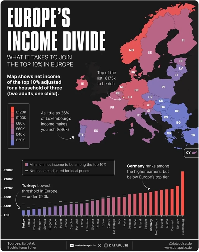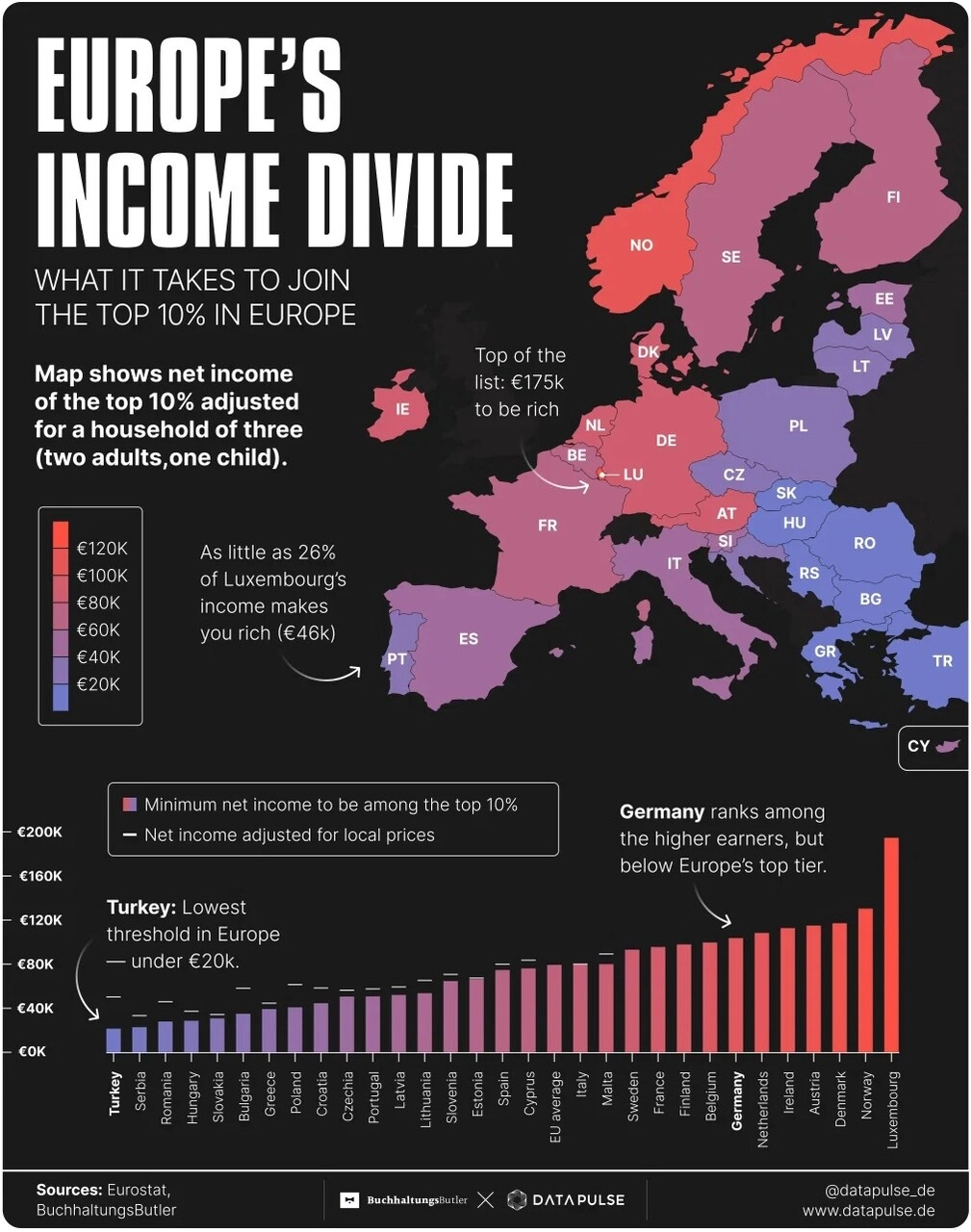 Hranice příjmu pro to, aby byl člověk v Evropě považován za bohatého, se mezi jednotlivými zeměmi výrazně liší. V Lucembursku začíná bohatství u tříčlenné domácnosti při ročním čistém příjmu 175 tisíc eur, zatímco v Turecku stačí k překročení této hranice v přepočtu méně než 20 tisíc eur.