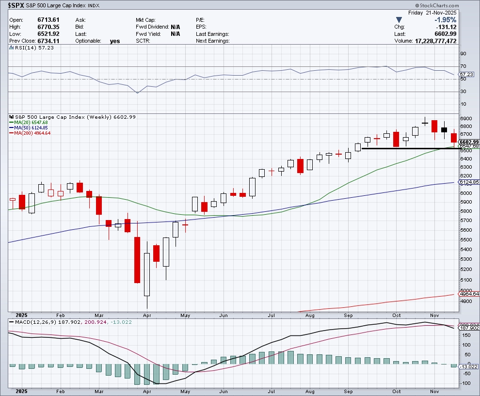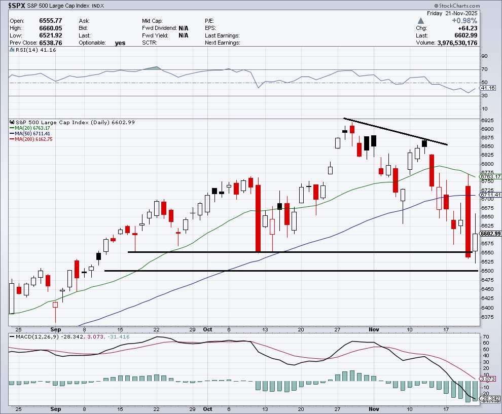 Ve středu po konci obchodování zveřejnila NVIDIA vynikající výsledky hospodaření i výhled, a ve čtvrtek trh otevíral ve výrazném plusu. Během dne ale došlo k nevídaně výraznému obratu (někteří stratégové propad připisují souvislostem s trhem s bitcoinem, který byl pod silným prodejním tlakem) a index uzavíral se silně medvědí svíčkou. V pátek pak náladu na trhu trochu vylepšil šéf newyorského Fedu Williams, který připustil prosincové snižování sazeb v USA. Celkově trh i tak ztratil za týden bezmála dvě procenta.