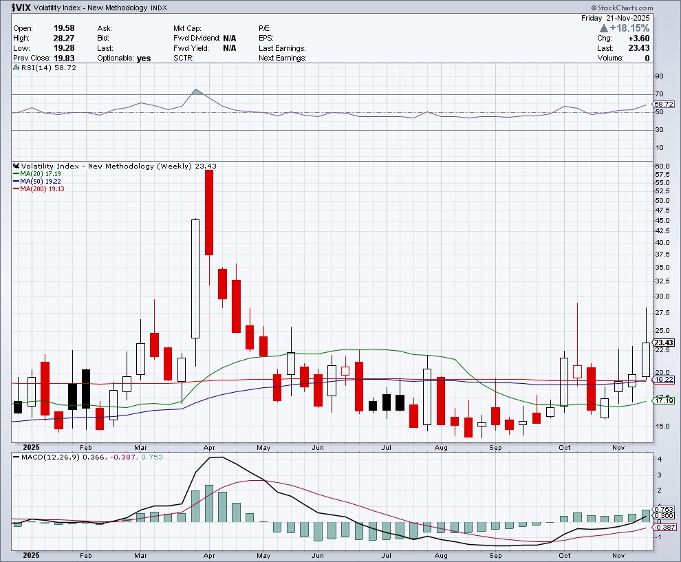 Index volatility VIX navzdory pátečnímu poklesu za týden stoupl o 18 % a intradenně se přiblížil k maximu z poloviny října. Je poměrně vysoko, což by mohlo na akciovém trhu přispět minimálně k pokračování pátečního růstu v reakci na silné poklesy.