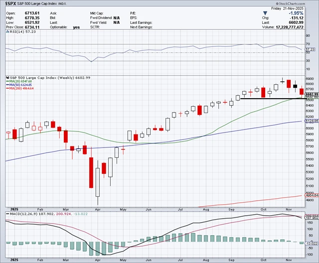 Úroveň podpory zůstává stejná, index S&P 500 testoval zásadní hladinu 6 500 až 6 550 (ve čtvrtek uzavíral na 6 538 a v pátek intradenně spadl na 6 521). Pokud by index podporu prolomil, narostla by pravděpodobnost dalšího sestupu a změny trendu. Nad 6 500 trh zůstává v býčím nastavení. Nejbližší rezistence je na 6 750 a další na historických maximech okolo 6 900.