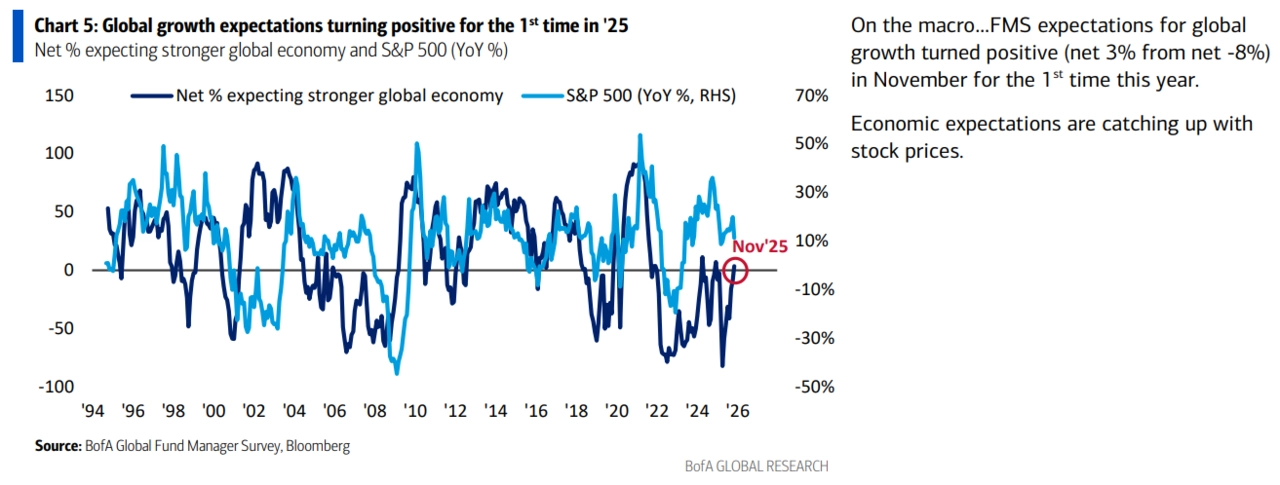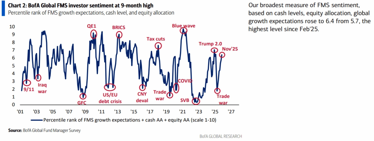 Investoři očekávají, že v roce 2026 budou z hlediska výnosnosti nejlepším aktivem akcie mimo USA a nejsilnější měnou japonský jen, zejména pokud Bank of Japan přistoupí ke zvýšení sazeb. Krátkodobě trhy zůstávají v napětí mezi optimismem ohledně AI a snižování sazeb Fedu a varovnými signály (kombinace "přehřátých" pozic, nízké hotovosti a obav z AI bubliny). To vytváří choulostivý koktejl, který se může bez prosincového uvolnění měnové politiky ve Spojených státech velice snadno rozlít.