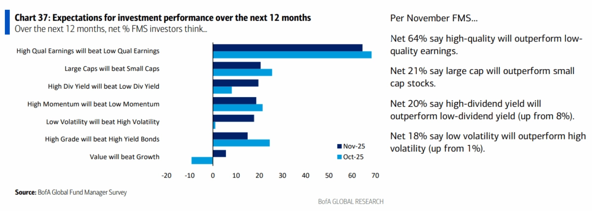 Stratég Michael Hartnett v komentáři k průzkumu píše o riziku výrazného RISK-OFF přeskupení portfolií během čtvrtého kvartálu. To by se podle něj nejvíce týkalo bankovních titulů a také rozvíjejících se trhů. První skupinu by mohly ovlivnit případné hlubší problémy na americkém úvěrovém trhu a slabost amerických spotřebitelů.