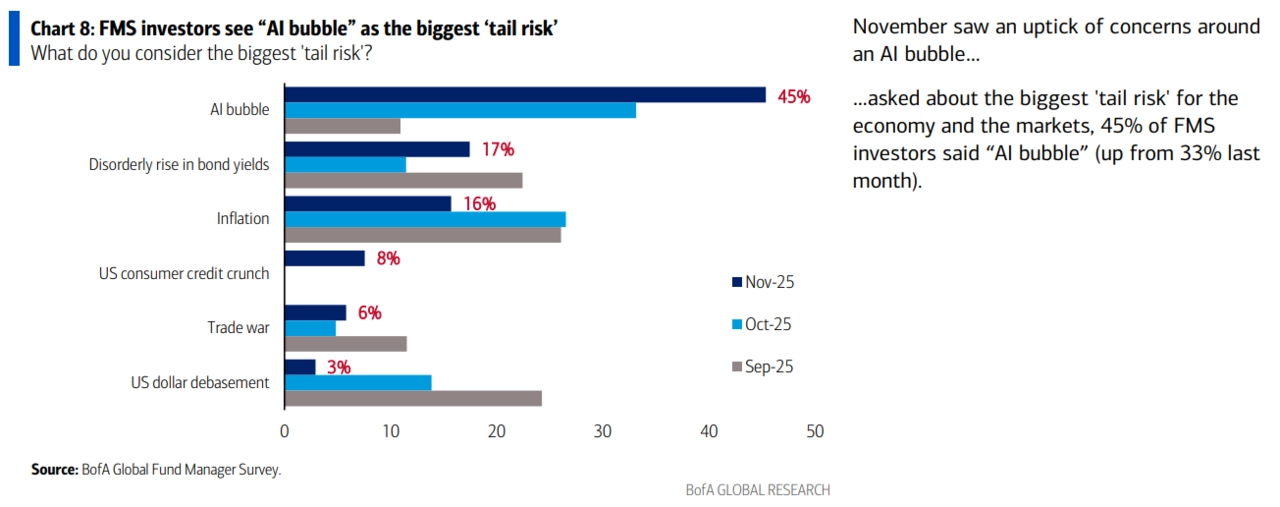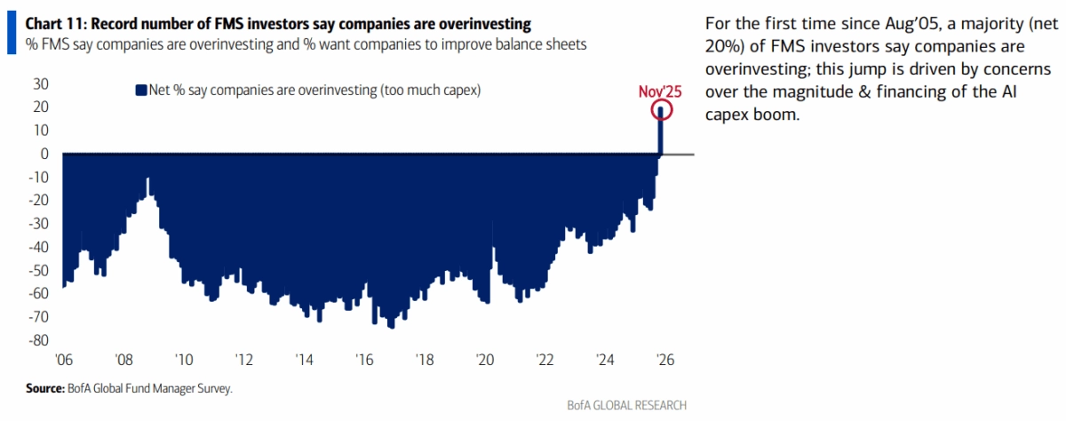 Hned 45 % manažerů označilo AI bublinu za největší riziko pro trhy a rekordní podíl dotázaných uvedl, že to firmy s investicemi do AI přehánějí. Poprvé po dvaceti letech tak převažuje názor, že jsou společnosti v rámci kapitálových výdajů příliš agresivní.