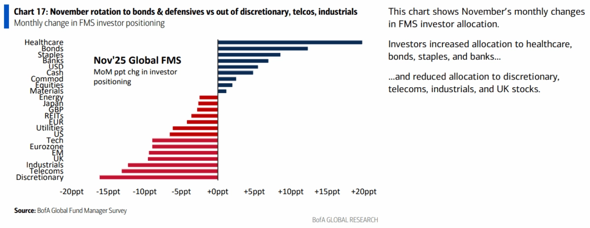 Globální investoři do poloviny listopadu (data z průzkumu se sbírala 7.–13. listopadu) masivně zvyšovali alokace kapitálu do akcií a komodit, zatímco podíl hotovosti v portfoliích klesl na 3,7 %. Tato úroveň je podle Bank of America historicky prodejním signálem. Pokaždé, když od roku 2002 klesla váha hotovosti na 3,7 % nebo méně, následoval v horizontu jednoho až tří měsíců pokles cen akcií a růst cen amerických státních dluhopisů.