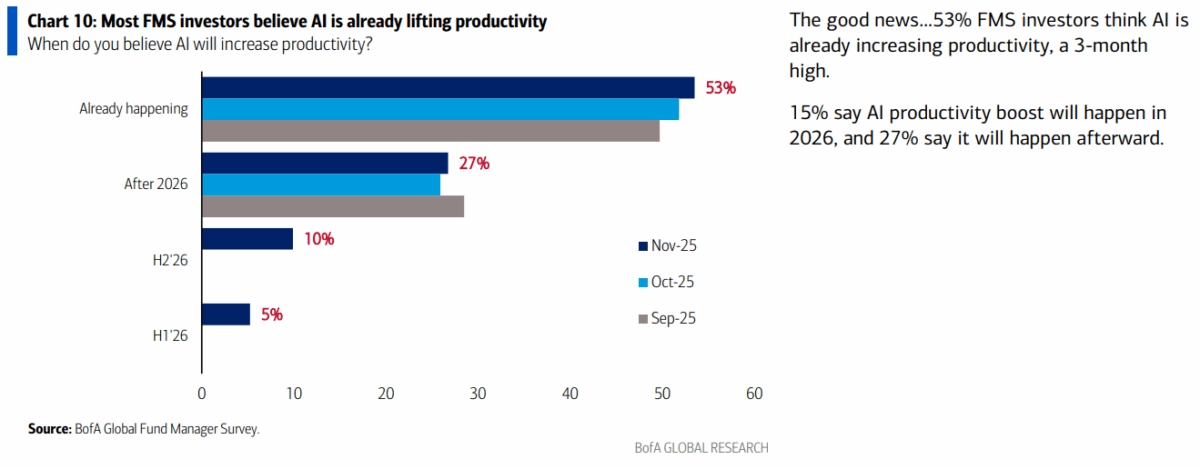 Dlouhodobé výhledy jsou navzdory krátkodobým obavám optimistické. Celých 45 % oslovených manažerů očekává, že výnos 10letých amerických státních dluhopisů bude na konci roku 2026 na úrovni 4–4,5 %. Podobně 43 % respondentů vidí index S&P 500 do konce roku 2026 v rozmezí 7 000 až 7 500 bodů. Za hlavní býčí faktor pro příští roky přitom investoři označují široké pozitivní dopady AI na produktivitu.
