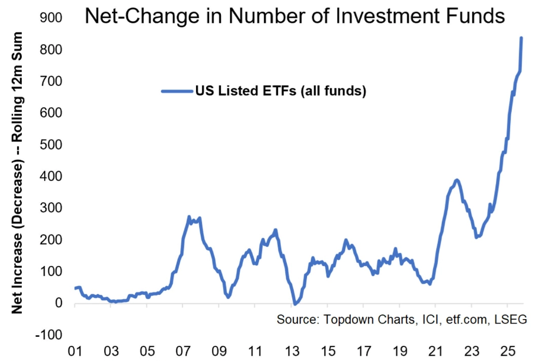 "Když jsem níže uvedený graf na základě dat vytvářel, několikrát jsem ho kontroloval, protože vypadal podezřele. Žádná chyba v něm ale není, prudký nárůst počtu amerických burzovně obchodovaných fondů (ETF) je realita," říká Callum Thomas z TOPDOWN CHARTS.