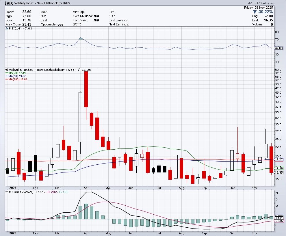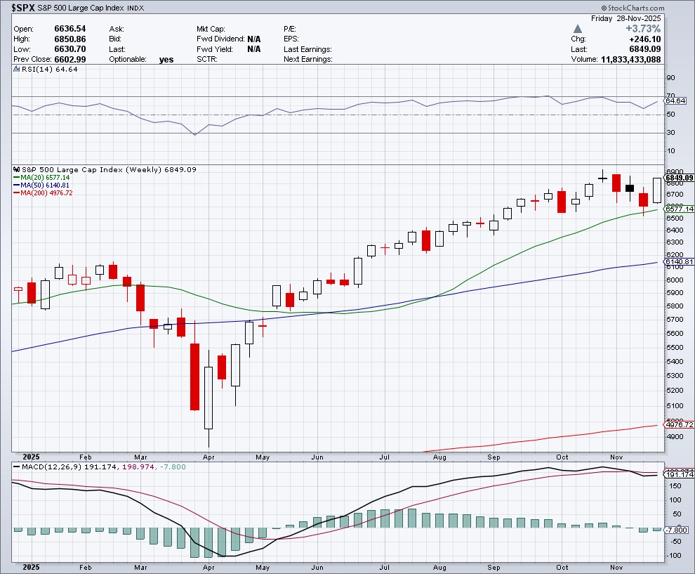 Dosavadní průběh roku na americkém akciovém trhu se vymykal sezónním historickým pravidelnostem, týden okolo Dne díkůvzdání byl ale ukázkově růstový. Index S&P 500 pokračoval v odrazu od důležitého supportu, vrátil se nad klouzavé průměry a celkově vzrostl o 3,73 %.
