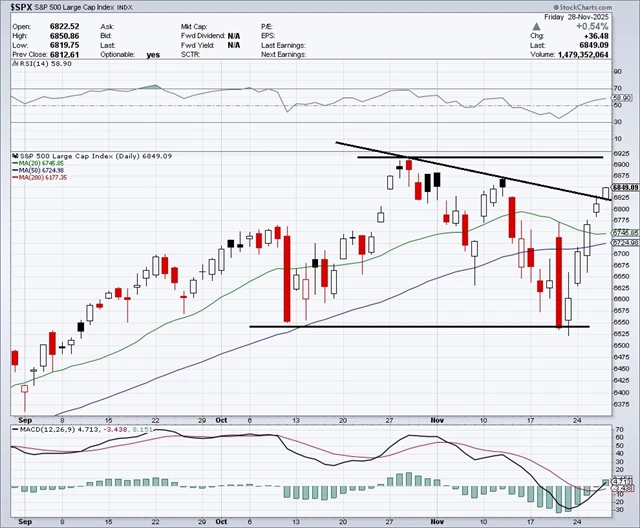 "Dosavadní průběh roku na americkém akciovém trhu se vymykal sezónním historickým pravidelnostem, týden okolo Dne díkůvzdání byl ale ukázkově růstový. Index S&P 500 pokračoval v odrazu od důležitého supportu, vrátil se nad klouzavé průměry a celkově vzrostl o 3,73 %. V předchozím týdnu testoval důležité pásmo podpory 6 500 až 6 550, od kterého se odrazil k silnému růstu. V uplynulém týdnu rostl ve všech čtyřech obchodních dnech a uzavřel procento pod historickým intradenním maximem (0,61 % pod zavíracím rekordem). Index v závěru týdne stoupl nad linii spojující nižší maxima, má za sebou ale další týden bez nového rekordu. Supporty a rezistence se tak nemění, důležitý support je v pásmu 6 500 až 6 550 a důležitá rezistence je okolo 6 900. S&P 500 tak už tři měsíce zůstává v pásmu úzkém zhruba 6 %," napsal v pravidelném technickém komentáři k dění na americkém akciovém trhu opční obchodník Josef Košťál.