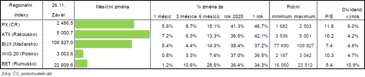 Za poslední měsíc (do 26. listopadu) se sledované středoevropské trhy vyvíjely pozitivně a všechny indexy posilovaly. Nejvíce se dařilo rakouským akciím (ATX přes 7 %), index pražské burzy PX a maďarský index BUX pak přidávaly přes 5 %. Rumunský BET a polský WIG 20 přidaly jen okolo procenta. Všem indexům se v posledních měsících nadmíru daří, všechny od začátku roku posilují přes 35 %, přičemž lídrem jsou české akcie (PX přes 41 %).