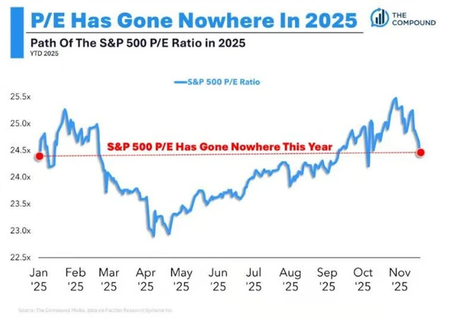 P/E indexu S&P 500 se letos navzdory výkyvům prakticky neposunulo. Znamená to jediné, a to že ceny amerických akcií vzrostly celkově prakticky přesně stejně jako zisky firem.