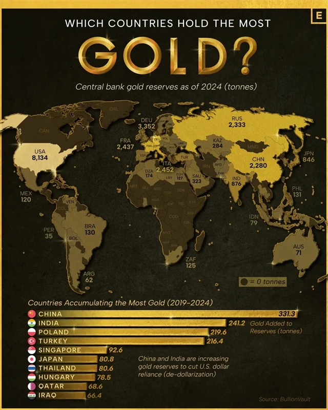 Růst je patrný hlavně v Asii. Čína navýšila své rezervy na zhruba 2 280 tun, aby snížila svou závislost na amerických dluhopisech a posílila mezinárodní roli jüanu. Indie vlastní kolem 876 tun a řadí se mezi největší světové držitele. Státy jako Turecko a Polsko výrazně přikupují zlato jako ochranu před inflací, kolísáním měn a geopolitickým napětím.