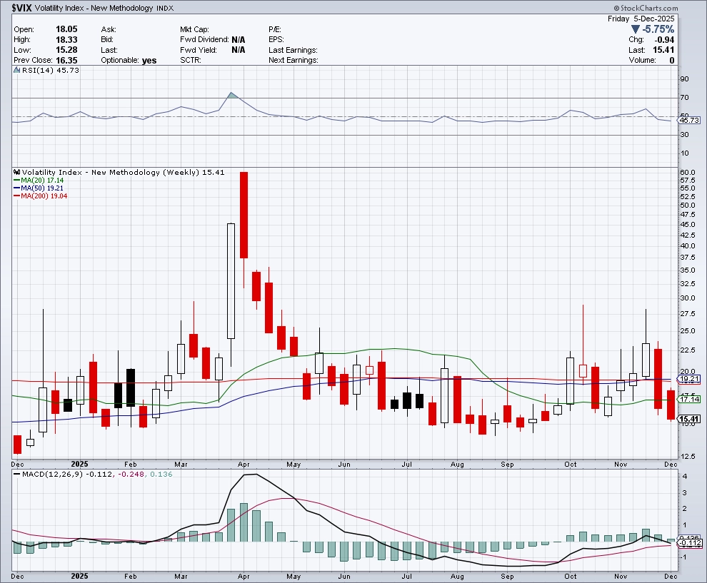 Index volatility VIX v týdnu klesl o 5,75 %. Je sice nad letošním minimem, ale na úrovni, během které letos akciový trh celkem neohroženě rostl. Vzestup nad 25 bodů přes zhruba dvěma týdny se (opět) ukázal jako krátkodobý nákupní signál pro akcie.
