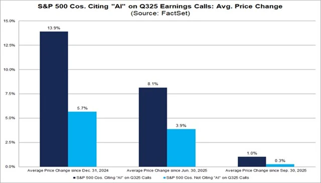 Zajímavé je i to, že akcie firem, které o AI během výsledkových hovorů mluvily, mají za sebou výraznější růst než ceny akcií společností, které se o AI nezmínily. Od začátku roku akcie prvních jmenovaných přidaly v průměru 13,9 %, akcie ostatních firem zpevnily jen o 5,7 %. Podobný rozdíl byl i v období od konce června a konce září. Investoři zkrátka stále vnímají angažovanost v oblasti AI jako růstový faktor.