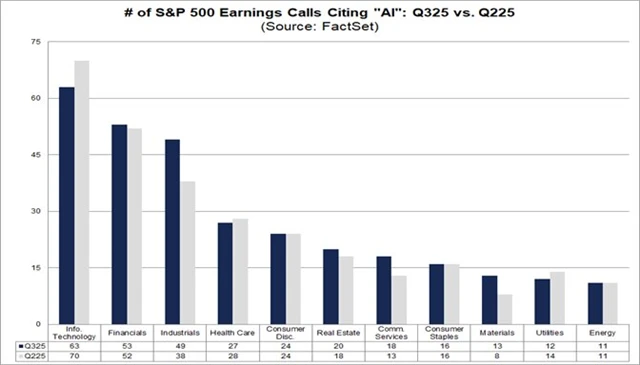 Zájem o umělou inteligenci nadále dominuje výsledkovým zprávám a konferenčním hovorům amerických veřejně obchodovaných firem. Počet zmínek o AI byl v posledních měsících rekordní.