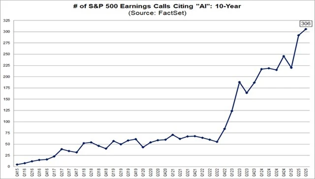 Společnost FactSet v přepisech konferenčních hovorů uskutečněných mezi 15. zářím a 4. prosincem zaznamenala zmínky o AI hned u 306 firem. Jde logicky o výrazně vyšší hodnotu než pětiletý průměr (136) nebo desetiletý průměr (86). Jde navíc o vůbec nejvyšší počet za celé poslední desetiletí, dosavadní rekord byl 292 zmínek o kvartál dříve. Před třemi lety zkrátka začal velký trend, který se stále rozšiřuje.