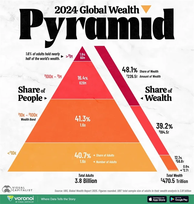 Svět v roce 2024 zbohatl. Globální hodnota osobního majetku vzrostla o 4,6 %, ale její rozdělení zůstálo značně nerovnoměrné. Na vrcholu pyramidy stojí elita asi 60 milionů lidí, tedy jen 1,6 % dospělé světové populace, kteří vlastní téměř polovinu globálního bohatství (226 bilionů dolarů). Pod nimi je 628 milionů lidí s majetkem 100 tisíc až 1 milion dolarů, kteří drží 39 % bohatství světa.