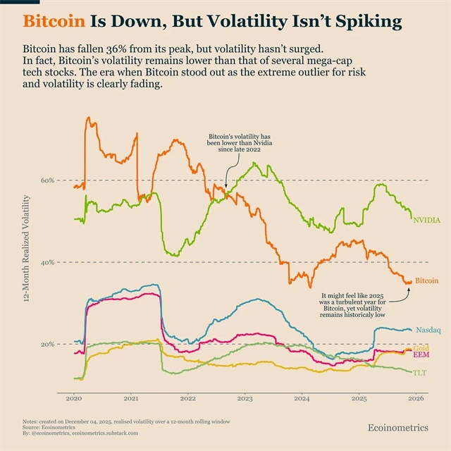 Rok 2025 byl pro bitcoin plný výkyvů. Přinesl nová cenová maxima i výrazné propady a trh neustále přepínal mezi risk-on a risk-off režimem. Přesto volatilita ceny bitcoinu po celý rok klesala a ani při poslední korekci výrazně nevzrostla. Od konce roku 2022 je bitcoin dokonce méně volatilní než některé mega caps, třeba NVIDIA.