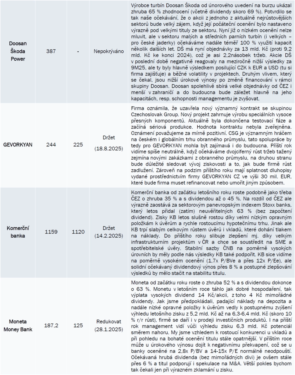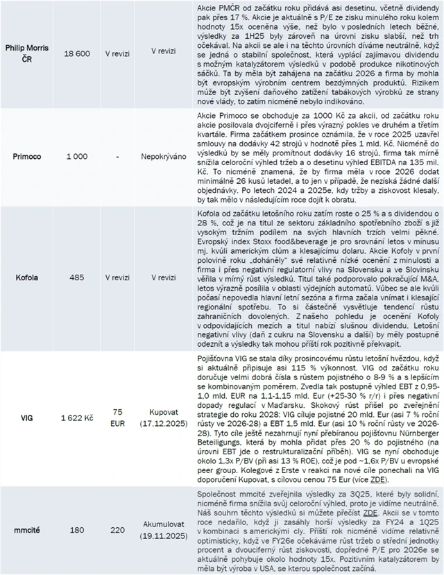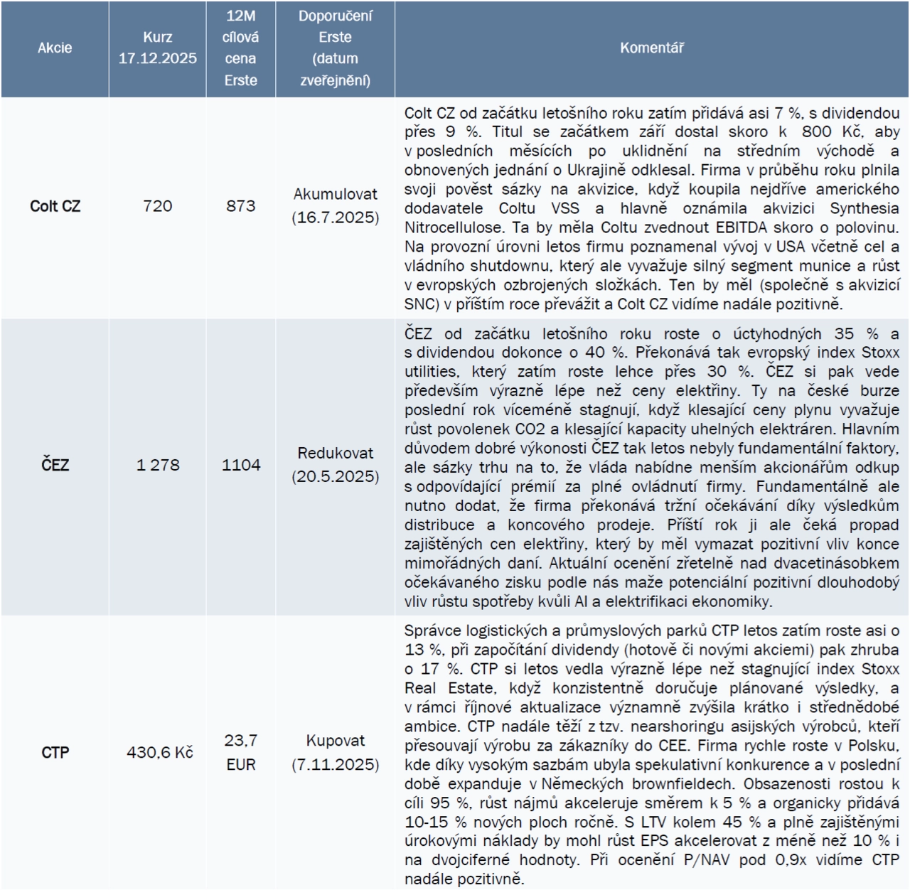 Další obdobný růst na BCPP pro rok 2026 nečekáme. Aktuální ocenění (forwardové P/E okolo 12) při očekávaném růstu ve středních až vyšších jednotkách procent nepůsobí nijak přehnaně, ale je to zároveň jen suma často velice rozdílných individuálních metrik. Z akcií, které vnímáme pozitivně z hlediska ocenění a růstu, bychom zmínili třeba Colt CZ Group, kterou podpoří i velká akvizice SNC. V případě společnosti ČEZ při P/E nad 20 se spíše čeká na Godota (myšleno odkup minoritních podílů). Banky jsou oceněné relativně vysoko, ale měla by je podporovat očekávaná stabilita sazeb ČNB a solidní dividendy.