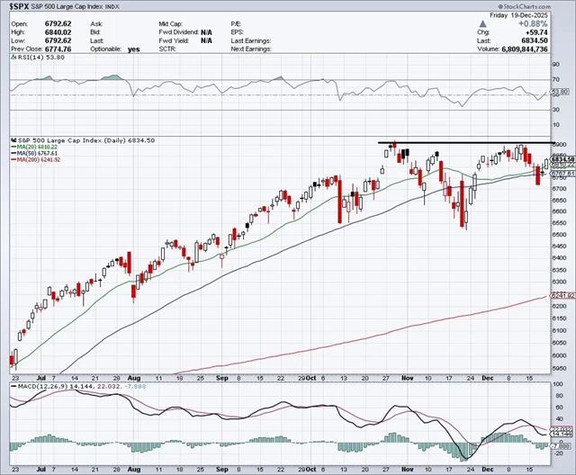 "Americký akciový index S&P 500 v první polovině uplynulého týdne pokračoval v sestupu z konce týdne předchozího. Dva poslední silné dny ale stačily k nápravě a skóre za poslední kompletní týden roku je +0,10 %. Index v týdnu klesl pod 20denní klouzavý průměr a jednou uzavřel i pod 50denním průměrem. Medvědí vývoj ale obchodníci odmítli, a index tak zůstává v pásmu vymezeném spodní silnou hladinou podpory na 6 500 až 6 550 a horní rezistencí na maximech okolo 6 920. Nový býčí signál by vznikl při proražení nad dosavadní rekord," napsal v pravidelném technickém komentáři k dění na americkém akciovém trhu opční obchodník Josef Košťál.