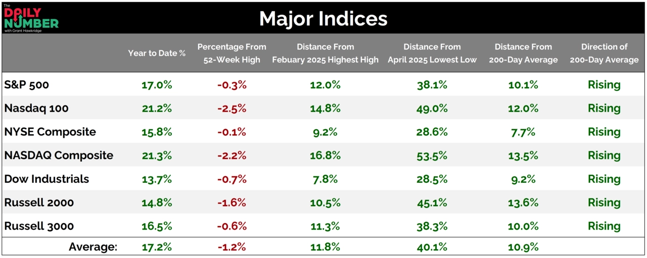 Všech sedm nejčastěji sledovaných akciových indexů v USA je v jasně růstovém trendu (údaje jsou o jeden den neaktuální, nejde ale o velké rozdíly a s výjimkou Russellu 2000 indexy v úterý mírně vzrostly, a tedy jen zvýraznily celkově pozitivní obrázek). Takhle vypadá široká participace na býčím trhu.