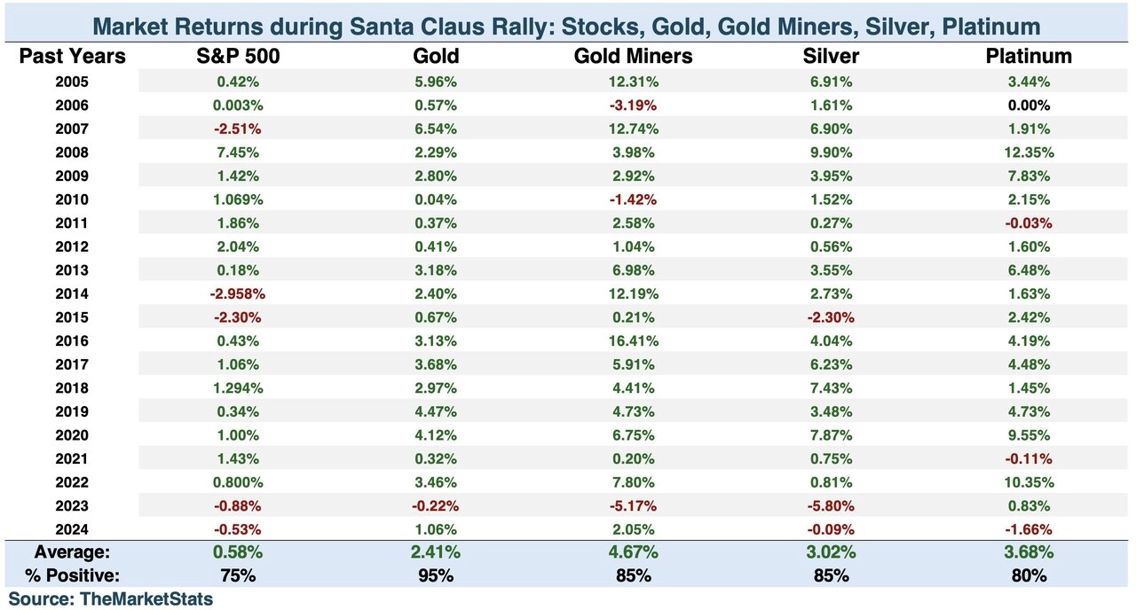 Ale nesmíme zapomínat na další investice. Třeba na drahé kovy, které v posledních dnech (také) přepisují rekordní tabulky. A takové zlato má v období Santa Claus rally v uplynulých dvaceti letech mimořádně dobrou "úspěšnost".