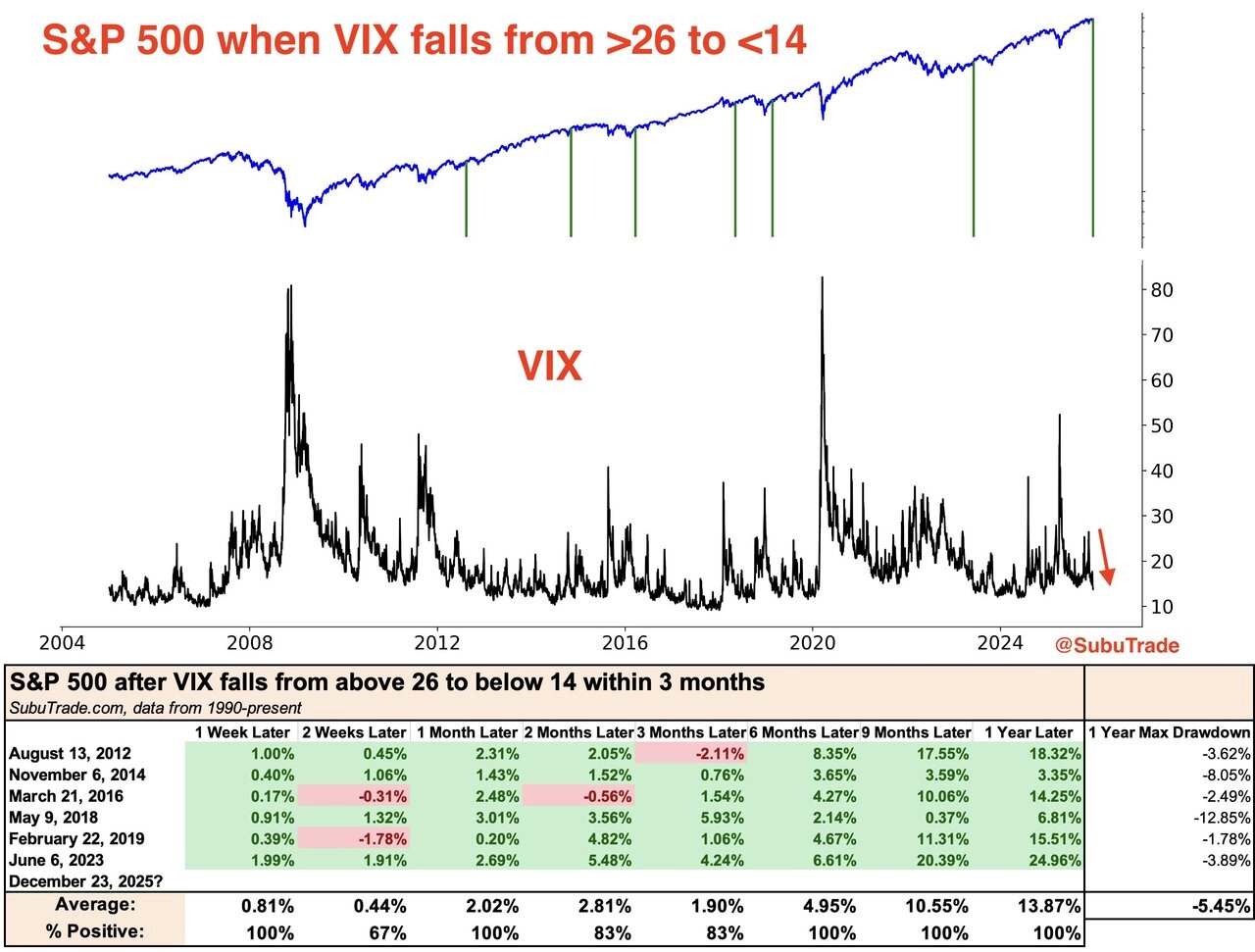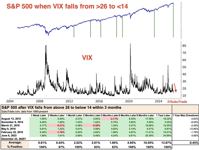 Ještě 20. listopadu se přitom VIX držel nad 26 body. Klesl tedy za necelých pět týdnů skoro na polovinu. Při tak rychlých "sešupech" přitom v minulosti akciový index S&P 500 v týdenním i měsíčním výhledu nikdy nebyl v minusu.