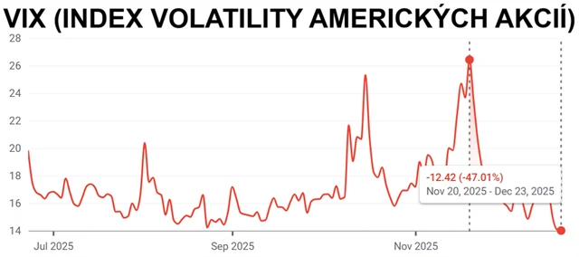 Index volatility VIX v úterý 23. prosince klesl na letošní minimum. Uzavřel na rovných 14 bodech a během dne se pochyboval i pod touto úrovní.