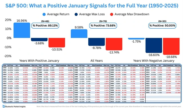 V burzovním almanachu se dočteme, že napovědět může už lednové obchodování, protože "jaký leden, takový rok". Když v prvním měsíci roku S&P 500 rostl, byl v plusu i za celý rok v 89 % případů, a to s průměrným zhodnocením o 17 % a průměrným maximálním průběžným poklesem o 10,5 %. Ztrátový leden znamenal v historii průměrný roční pokles o 1,8 %, celoroční vzestup jen v polovině případů a také průměrný maximální průběžný pokles o poznání hlubší.