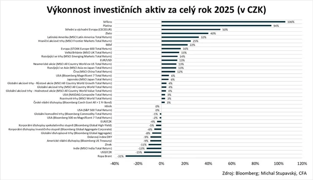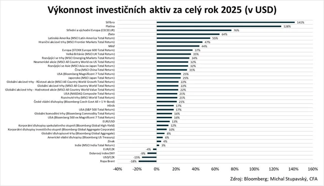Loni ale zároveň hodně ztrácel americký dolar. Stratég Michal Stupavský z Consequ to ilustruje dvěma přehlednými grafy. Na prvním je zhodnocení aktiv v amerických dolarech, na druhém v českých korunách. Pro české investory velice důležité srovnání.