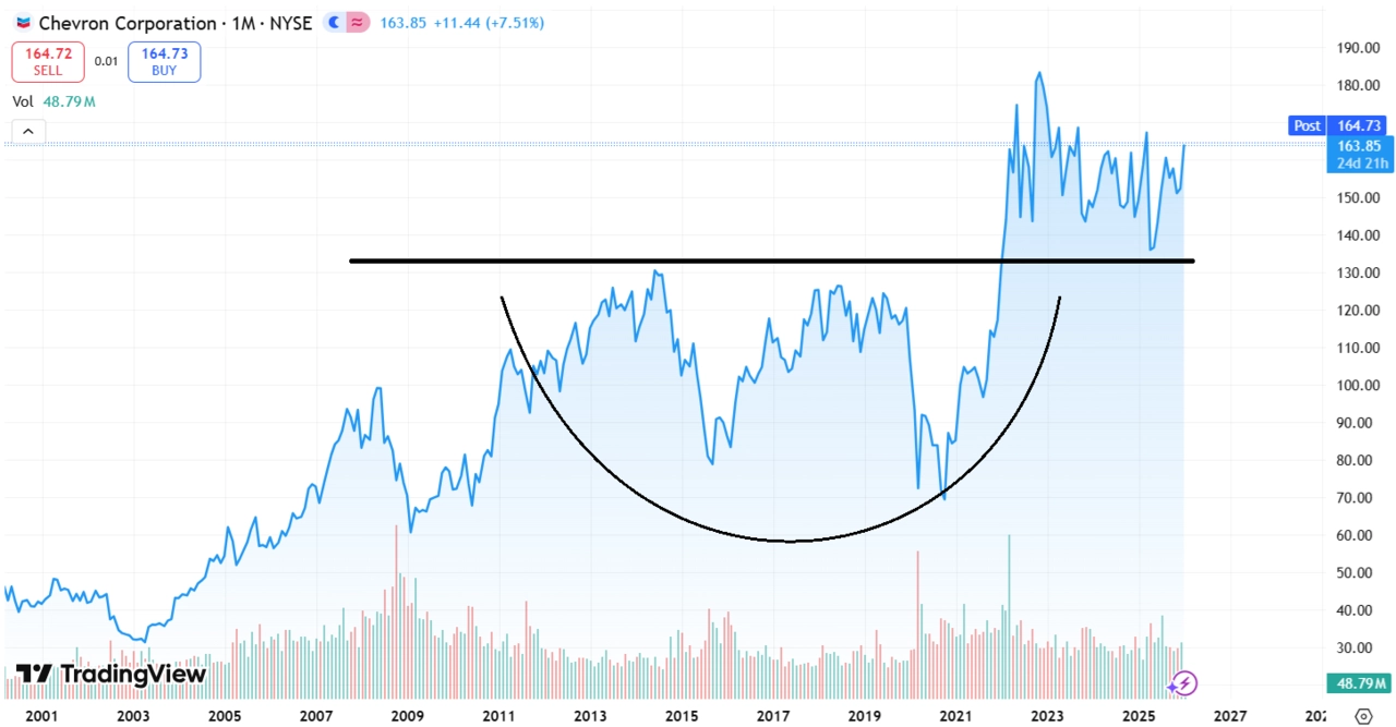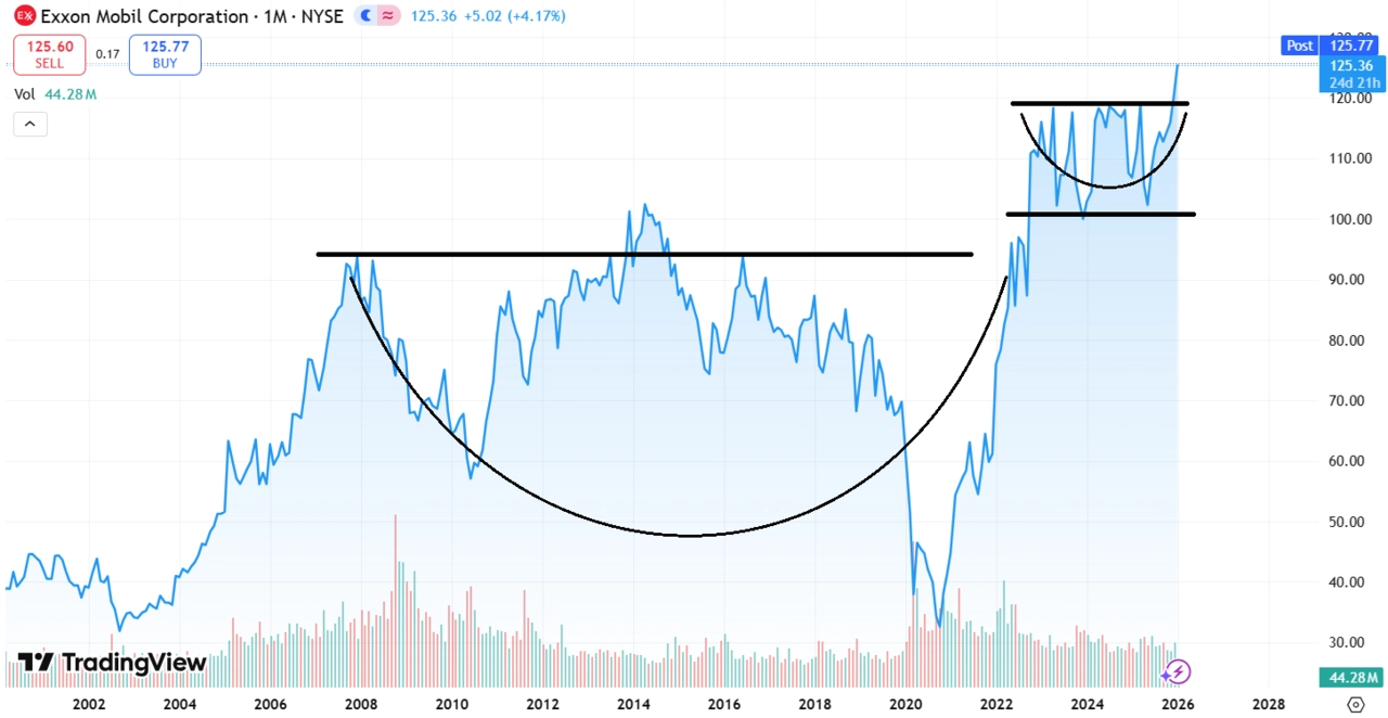 To ostatně naznačil pondělní vývoj, kdy velké firmy jako ExxonMobil, Chevron, ale třeba i Halliburton na burze výrazně posílily. Zvláštní pozornost si přitom zaslouží právě ExxonMobil, největší americká ropná společnost. Její akcie po cenových vrcholech v letech 2008 a 2014 definitivně prorazily výše až v roce 2022, od té doby se ale jejich kurz pohybuje spíše do strany. To ale není negativní signál, jde o několikaletou konsolidaci nad bývalou rezistencí, během níž se absorboval veškerý možný "převis nabídky".