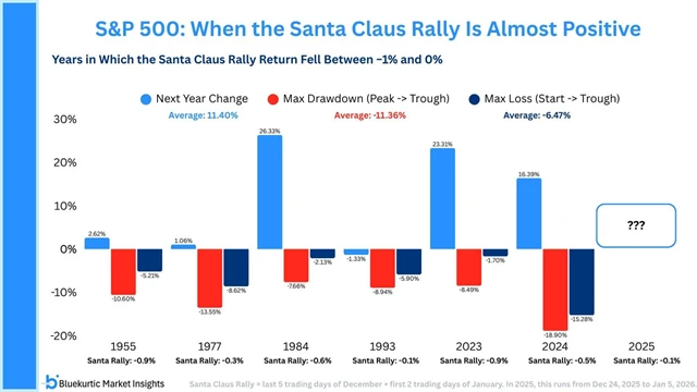 Santa Claus rally letos tak docela nedopadla, index S&P 500 odepsal 0,11 %. Když Santa v minulosti doručil ztrátu do jednoho procenta, dopadlo to v zahájeném kalendářním roce následovně. Loni to třeba byla celkem jízda, v dolarech ale nakonec pořád nadprůměrně pozitivní. A mimochodem, hned další sezónní vzoreček, tedy zisk v prvních pěti obchodních dnech roku, letos pro akciové býky dopadl na jedničku.