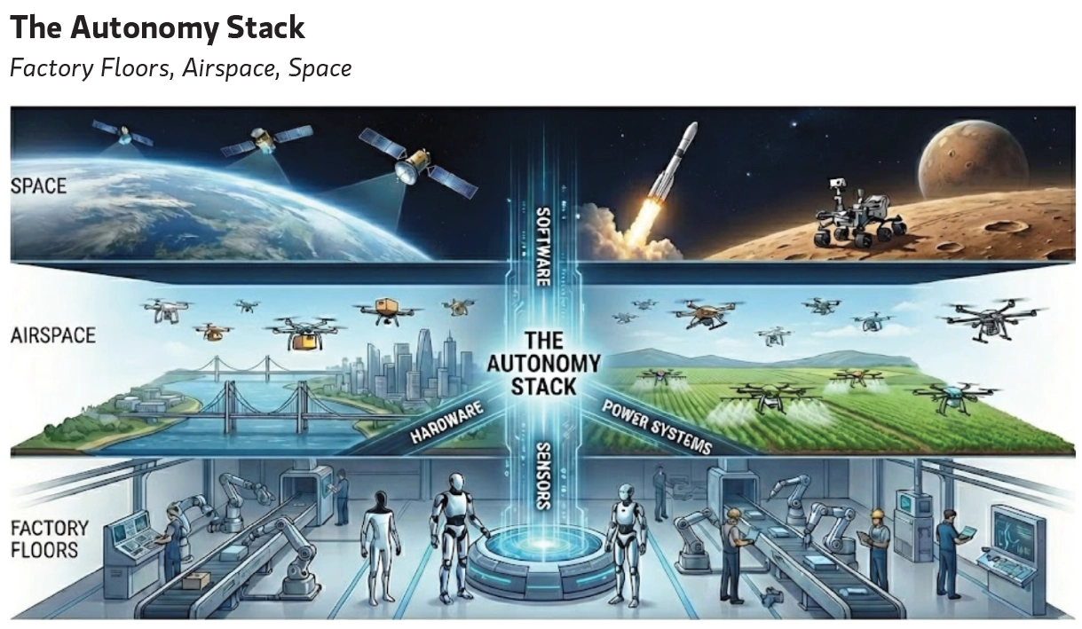 Paralelně s tím se rozvíjí "autonomy stack". Jde o vrstvu autonomie, která se přesouvá z továren do vzdušného prostoru (drony) a do vesmíru, kde je nezávislé rozhodování strojů prakticky nezbytné.