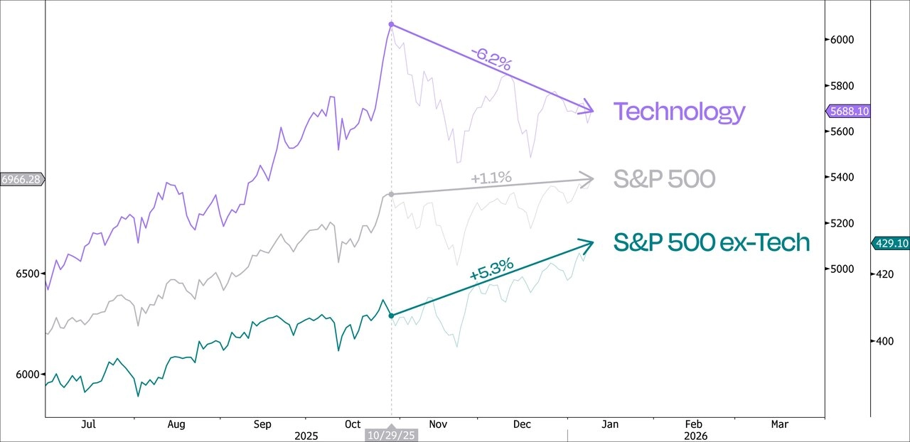 A rotace probíhá také v samotných Spojených státech. Lídr posledních let, technologický sektor, relativně zaostává za jinými odvětvími. I tak je S&P 500 nejvýše v historii.